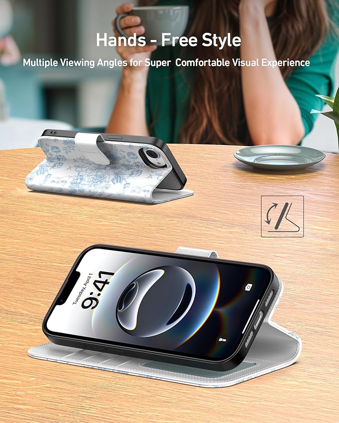DEENAKIN for iPhone 16e Wallet Case with Card Holder + Cash Clip, RFID-Blocking, Military-Grade Drop Protection, Magnetic Closure with Leather Kickstand - Blue Floral Design