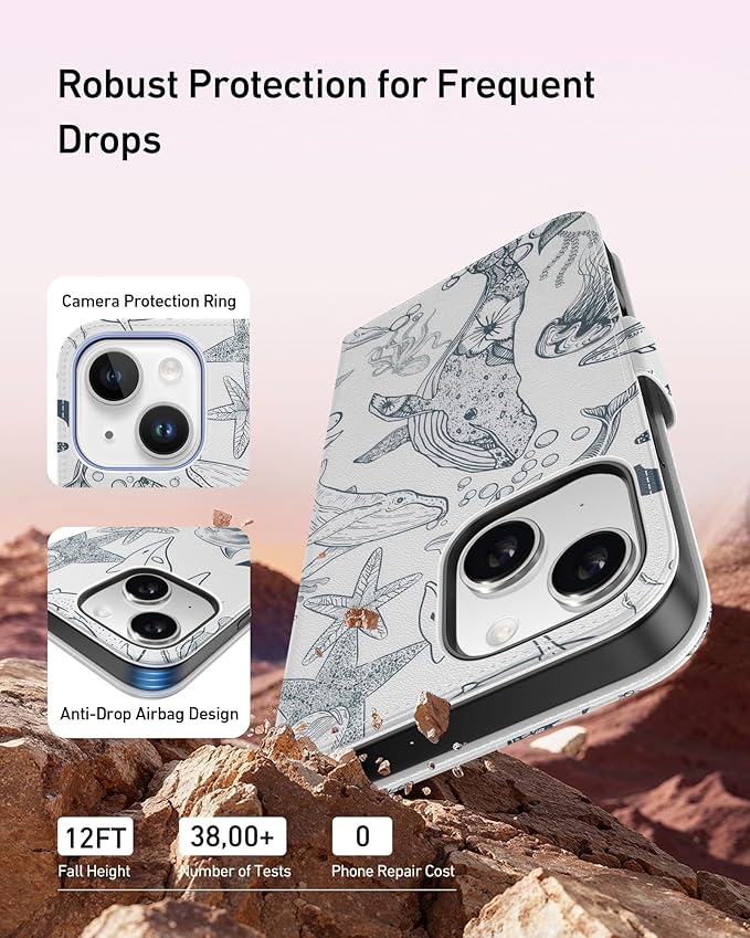 DEENAKIN for iPhone 15 Wallet Case with Card Holder + Cash Clip, RFID-Blocking, Military-Grade Drop Protection, Magnetic Closure with Leather Kickstand - Dynamic Marine Life