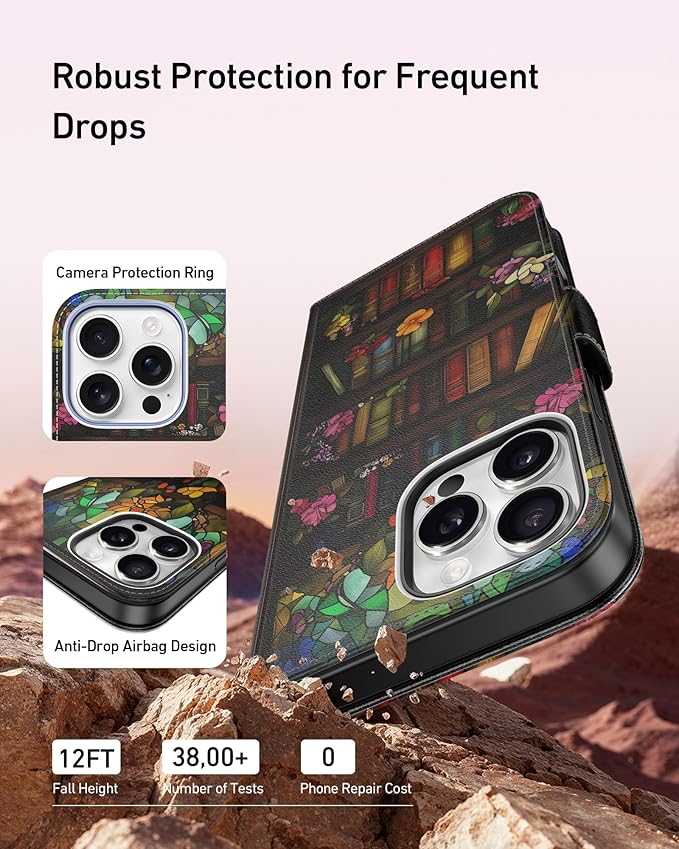 DEENAKIN for iPhone 15 Pro Max Wallet Case with Card Holder + Cash Clip, RFID-Blocking, Military-Grade Drop Protection, Magnetic Closure with Leather Kickstand - Bookshelf Flowers