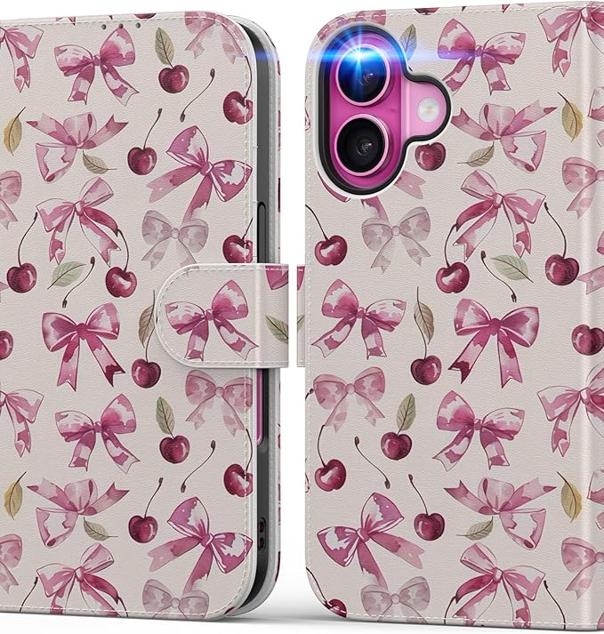 DEENAKIN for iPhone 16 Wallet Case with Card Holder + Cash Clip, RFID-Blocking, Military-Grade Drop Protection, Magnetic Closure with Leather Kickstand - Cherry & Bowknot