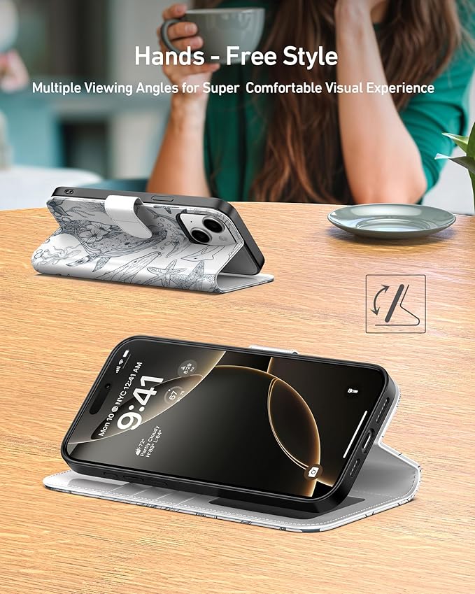 DEENAKIN for iPhone 15 Plus Wallet Case with Card Holder + Cash Clip, RFID-Blocking, Military-Grade Drop Protection, Magnetic Closure with Leather Kickstand - Dynamic Marine Life