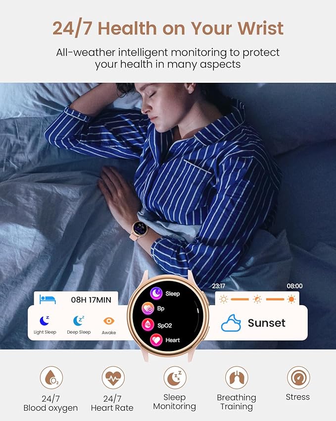 - 【Advanced Health Monitoring】- Stay on top of your well-being. Equipped with the latest sensors, this smart watches for women tracks your heart rate, blood oxygen levels, sleep quality, stress levels, and even your mood. Stay informed about your health and make smarter lifestyle choices with real-time data(The product is not a medical device and the data cannot be compared to medical device data)
