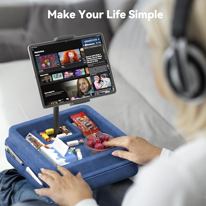KDD Tablet Pillow Holder - 360°Adjustable iPad Pillow Stand for Lap, Bed and Desk - Gooseneck Tablet Soft Pad Dock with Storage Tray and Pocket Compatible with iPad Pro 12.9, Air Mini, Phone,(Blue)