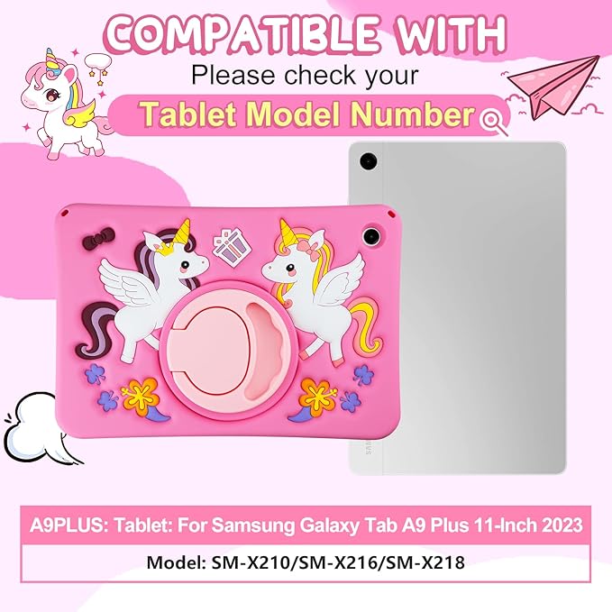 - Compatibility: This cute unicorns tablet case for Samsung Galaxy Tab A9+ Plus case for kids and girls is ONLY Compatible with Galaxy Tab A9 Plus 11-Inch 2023 Release Model (SM-X210/SM-X216/SM-X218) Tablet. Please Noted: Not Compatible with any other device. Please check your device model before purchasing.
