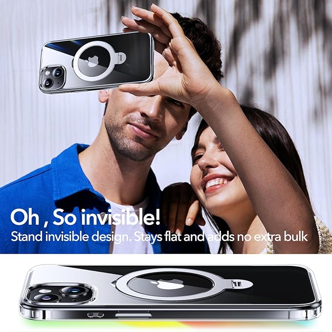 - [360° ALL-in-ONE Rotating Stand, Ring Holder, and Magneitc Charging] It’s everything you need, without the excess. This clear magnetic iPhone 13/14 phone case with stand ring effortlessly blends style and function. The 360° magnetic rotatable ring holder stays hidden when not in use — keeping the silhouette clean and minimal. When opened, it folds into a stable triangle stand, ready for hands-free moments on any surface. The ring holder fits naturally in your hand, offering a comfortable grip or an extra hook when life gets busy