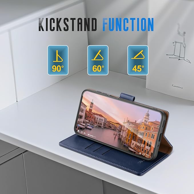 - 【Magnetic Card Slots & Adjustable Stand】---The product includes 3 independent card slots and 1 hidden cash pocket, secured by a strong magnetic closure to prevent cards from falling out. The book-style flip design transforms into a multi-angle stand, allowing seamless switch between portrait and landscape modes—hands-free viewing for movies or reading