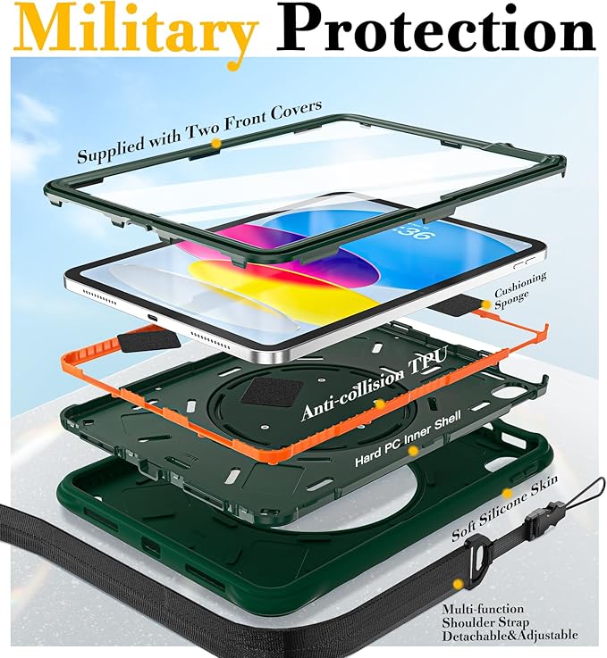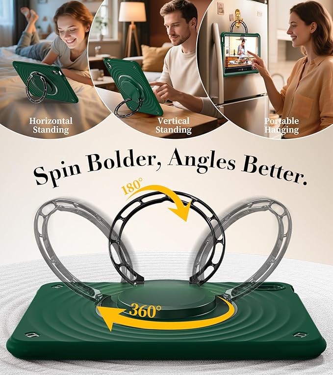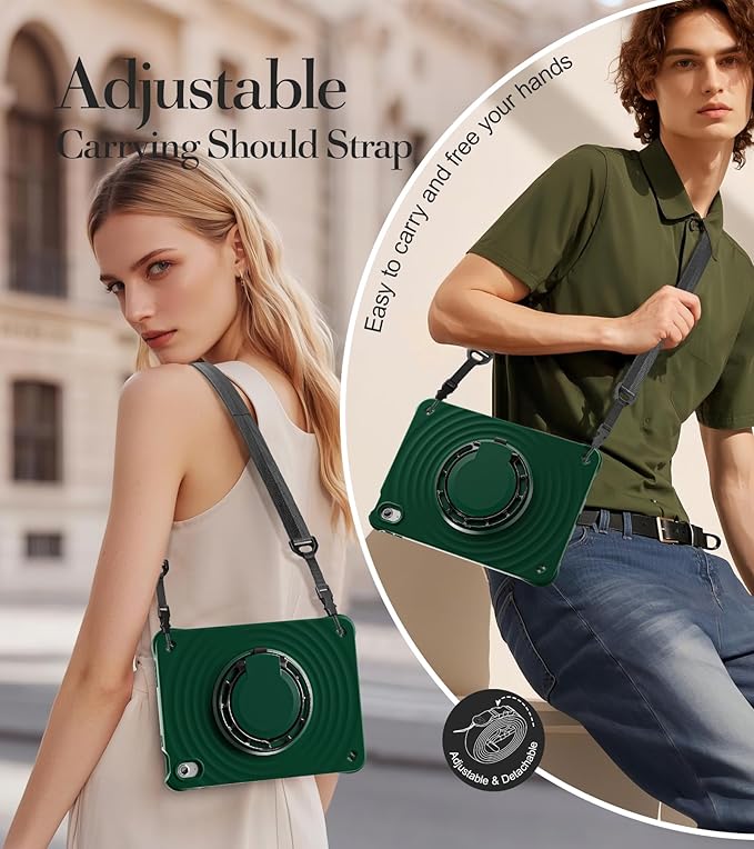 - [360°Rotating 180°Folding Ring Handle/Stand]:This iPad a16 11/10 Gen case features a 180° foldable & 360° rotating Zinc Alloy stand, offering limitless viewing angles for optimal comfort. Whether you're working, streaming, or browsing, effortlessly adjust your iPad to portrait, landscape, or hanging modes.The adjustable shoulder strap allows you to carry or hang your iPad at any time, so that you can provide more convenience in outdoor sports, traveling.