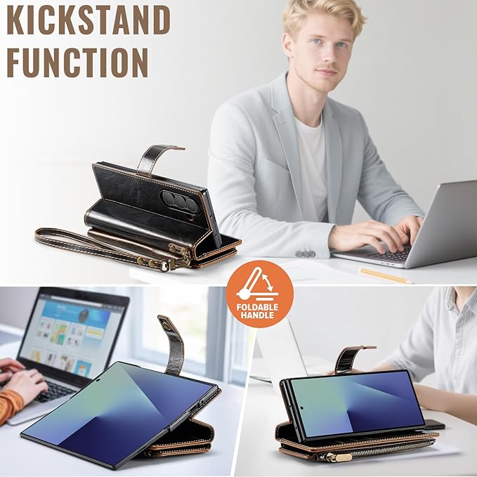 - for Galaxy Fold 7 Case with Kickstand: Built in double magnetic clasp of wallet case, it can hold your phone stably; The hands-free kickstand flip holster allows your phone standing independently, which is perfect for video calls, reading, working or movie-watching anywhere