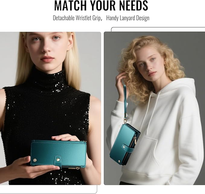 Vinich for Samsung Galaxy Z Fold 7 Wallet Case with Card Holder, Detachable Strap RFID Blocking Credit Slots Kickstand Shockproof Phone Cover for Women Men, Bluish Green