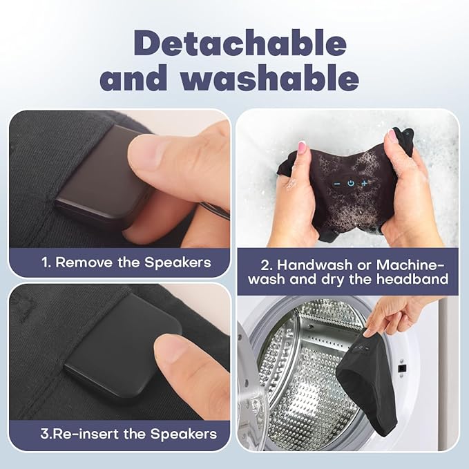 - Detachable and washable: The headband earphones are easy to assemble, the wireless speaker inside the headband is detachable and the headband are washable