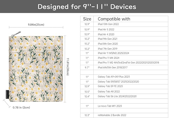 - For 9-11 Inch Tablets: Our 9-11 inch tablet carrying case is compatible with iPad 10th Gen 10.9" 2022, iPad (A16) 11" 2025, iPad 10.2" 9th 8th 7th Gen 2021 2020 2019, iPad Air 11" M3 M2 2025 2024, iPad Pro 11" M4 M2 2024-2018, iPad Air 5th 4th Gen 10.9 2022 2020; Galaxy Tab A9+ Plus 11" 2023, Galaxy Tab S9 FE 10.9" 2023, Galaxy Tab A8 10.5", Galaxy Tab S9 S8 S7 11", Galaxy Tab S6 Lite 10.4"; reMarkable 2 10.3"; Tab M11 11”; and other 9-11 inch device.
