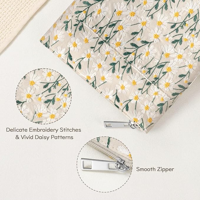 9-11 Inch Embroidered Daisy Padded Carrying Case Protective Tablet Sleeve for iPad A16 11th Gen 11"/10th Gen 10.9", iPad Air 11"/Pro 11"/Air 5th 4th 10.9", Galaxy Tab A9+ Plus 11", Beige