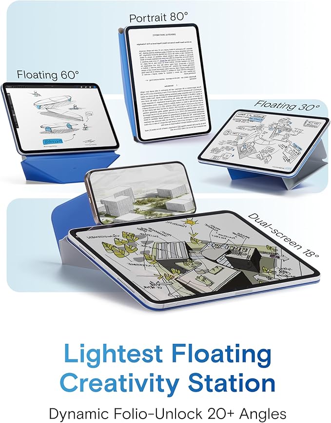 - Ultimate Ergonomic Floating Modes - MOFT Dynamic Folio Case makes iPad ergonomics effortless for mobile creativity - featuring a single-piece structure that effortlessly folds into a workstation lifting iPads up 2-inches. Frictionless angle shifts between 30° and 60° keep you aligned in your input-output framework.