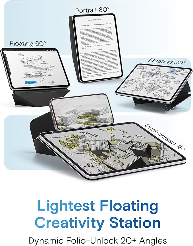 - Ultimate Ergonomic Floating Modes - MOFT Dynamic Folio Case makes iPad ergonomics effortless for mobile creativity - featuring a single-piece structure that effortlessly folds into a workstation lifting iPads up 2-inches. Frictionless angle shifts between 30° and 60° keep you aligned in your input-output framework.