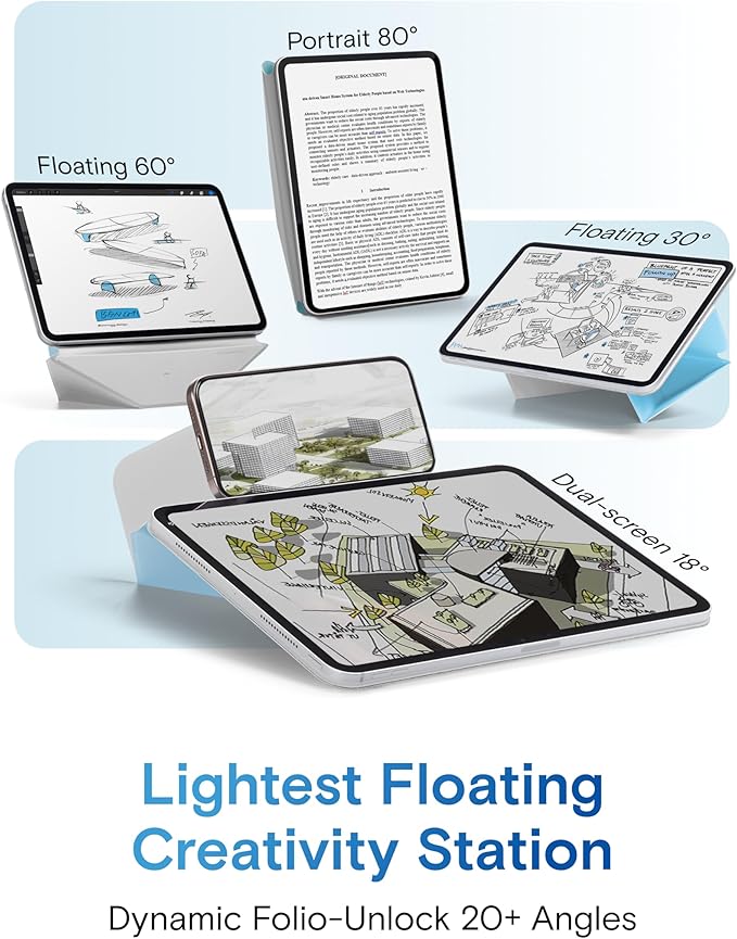 - Ultimate Ergonomic Floating Modes - MOFT Dynamic Folio Case makes iPad ergonomics effortless for mobile creativity - featuring a single-piece structure that effortlessly folds into a workstation lifting iPads up 2-inches. Frictionless angle shifts between 30° and 60° keep you aligned in your input-output framework.