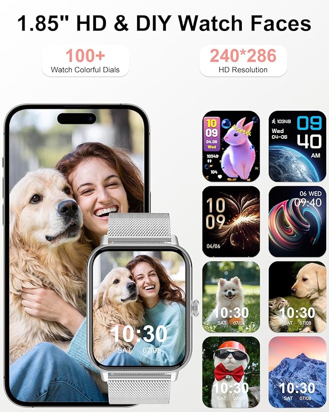 Smart Watch for Women with Bluetooth Call Answer/Dail,1.85" DIY Dial Fitness Watch with Heart Rate Sleep Monitor Step Counter 120+ Sports Modes Waterproof Women's Smart Watch for Android iOS (Silver)