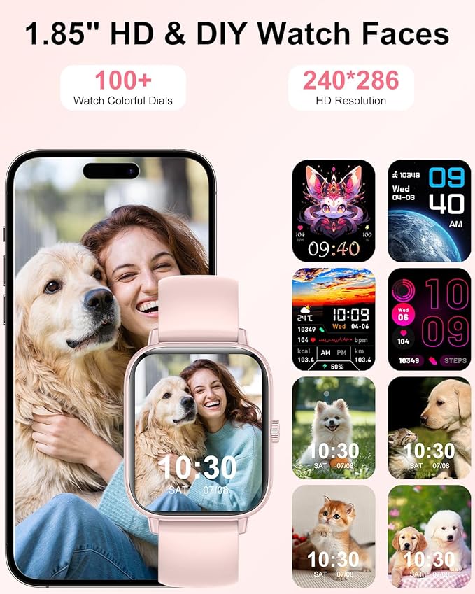 Smart Watch for Women with Bluetooth Call Answer/Dail,1.85" DIY Dial Fitness Watch with Heart Rate Sleep Monitor Step Counter 120+ Sports Modes Waterproof Women's Smart Watch for Android iOS (Pink)