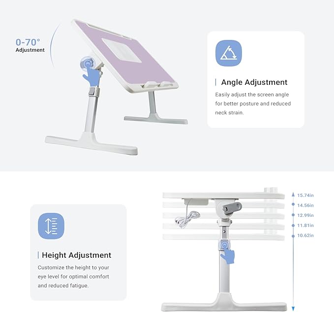 - 【📐Adjustable Size for Optimal Use】Measuring 15.74 x 23.62 inches(60*40cm), this height-adjustable laptop table adapts from 10.62" to 15.74"(27-40cm), thanks to its convenient auto-lock buttons. Its foldable legs ensure easy storage, and the 24.4 inches leg clearance offers comfortable movement. The tabletop's angle is adjustable up to 70°, promoting better posture and reducing strain.