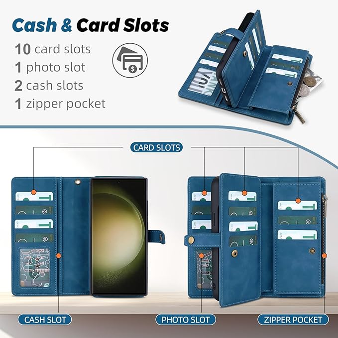 - Multi Card Slot Design: TwoHead for Samsung S23 ultra case wallet with 11 card slots,2 cash slots and 1 zipper pocket,there's plenty of room in it for your ID card ,driver license,credit cards,bills,coins and a small amount of cash,which let you keep the essentials organized well.It's a good choice for traveling, shopping and partying.