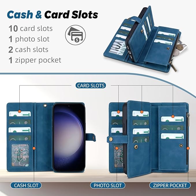 - Multi Card Slot Design: TwoHead for Samsung S23 case wallet with 11 card slots,2 cash slots and 1 zipper pocket,there's plenty of room in it for your ID card ,driver license,credit cards,bills,coins and a small amount of cash,which let you keep the essentials organized well.It's a good choice for traveling, shopping and partying.