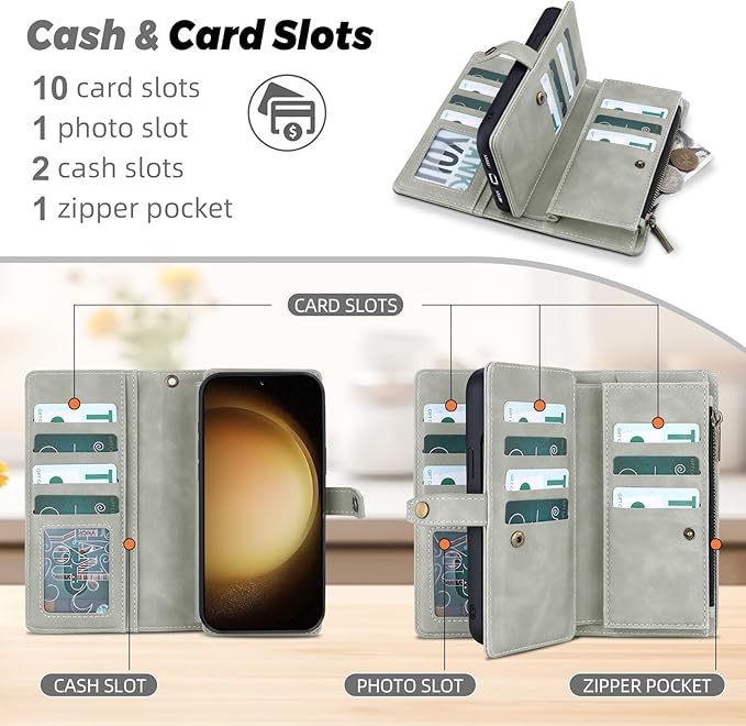 - Multi Card Slot Design: TwoHead for Samsung S23 plus case wallet with 11 card slots,2 cash slots and 1 zipper pocket,there's plenty of room in it for your ID card ,driver license,credit cards,bills,coins and a small amount of cash,which let you keep the essentials organized well.It's a good choice for traveling, shopping and partying.