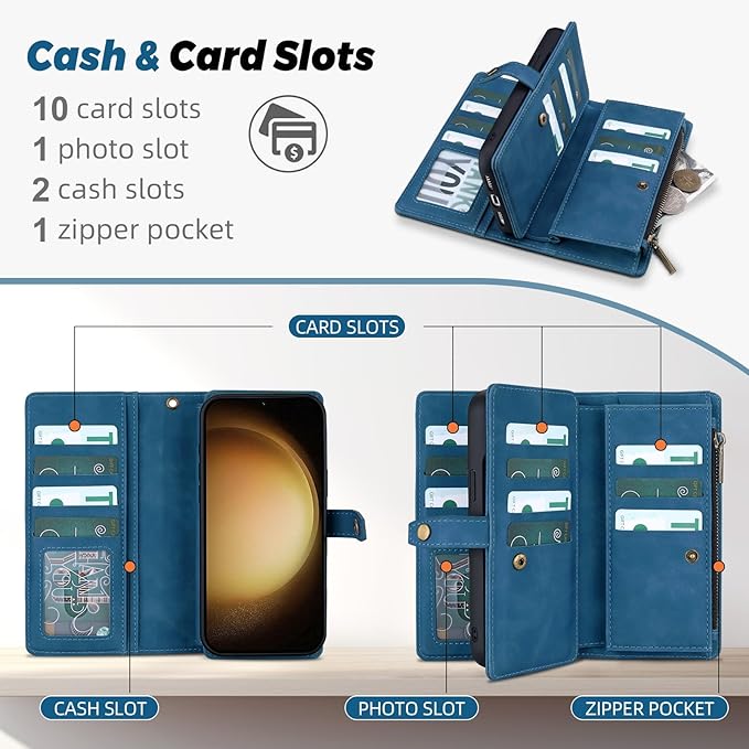 - Multi Card Slot Design: TwoHead for Samsung S23 plus case wallet with 11 card slots,2 cash slots and 1 zipper pocket,there's plenty of room in it for your ID card ,driver license,credit cards,bills,coins and a small amount of cash,which let you keep the essentials organized well.It's a good choice for traveling, shopping and partying.