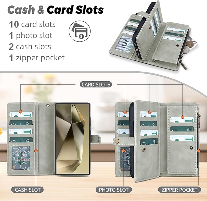 - Multi Card Slot Design: TwoHead for Samsung S24 ultra case wallet with 11 card slots,2 cash slots and 1 zipper pocket,there's plenty of room in it for your ID card ,driver license,credit cards,bills,coins and a small amount of cash,which let you keep the essentials organized well.It's a good choice for traveling, shopping and partying.