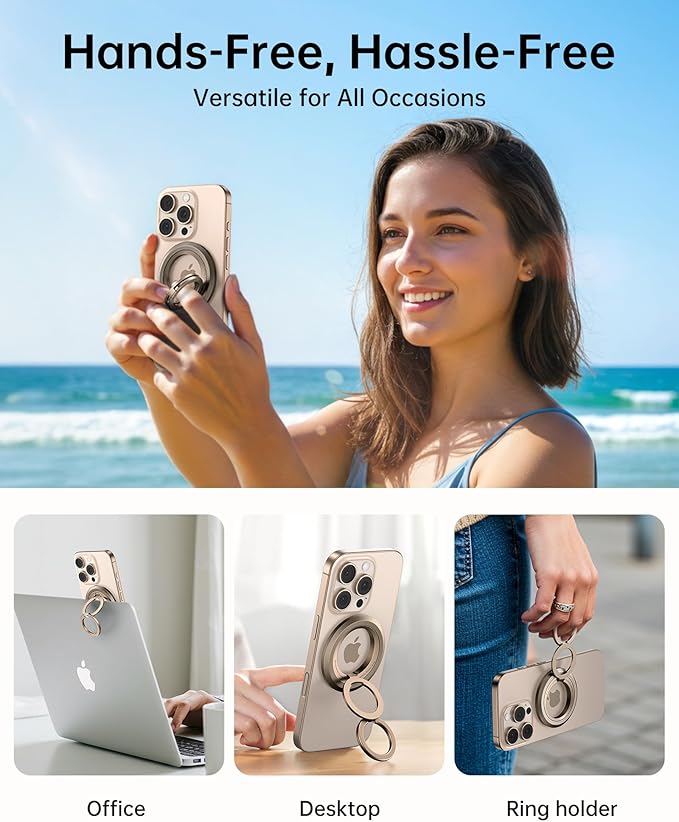 - 【360° Rotatable & 170° Foldable Design】 The dual-ring design allows for multi-angle adjustments to meet different usage needs. The stable hinge lock system is perfect for office video calls, selfies, and media streaming. This magnetic phone ring holder has been tested to withstand over 6000 folds without loosening, significantly improving its durability.