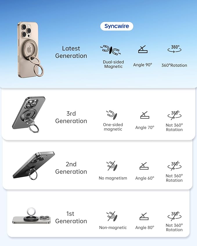 - 【Super Strong Magnetic & MagSafe Compatibility】 The Syncwire MagSafe Phone Grip is made with N52 NdFeB magnets, ensuring seamless attachment to MagSafe-enabled phones and cases with reinforced magnets. It also provides universal compatibility when used with the included magnetic ring for non-MagSafe devices. The magnetic strength increases by 5 times when used with the provided metal ring.