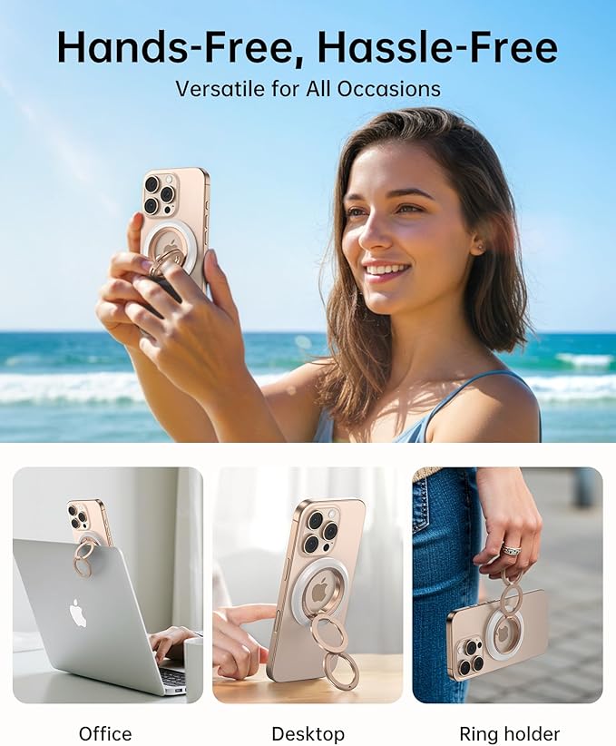 - 【Experience Ultimate Versatility with the Syncwire MagSafe Phone Grip】 The perfect hands-free solution for crowded commutes on subways or buses. Whether placed on your desk, kitchen counter, or used during video calls, movie watching, music listening, or makeup application, the Syncwire Phone Ring Stand elevates your daily activities with convenience and style.【What You Get】Syncwire Magnetic Phone Ring Holder for MagSafe, 2 Round Metal Rings (White & Black), Positioner, User Manual.