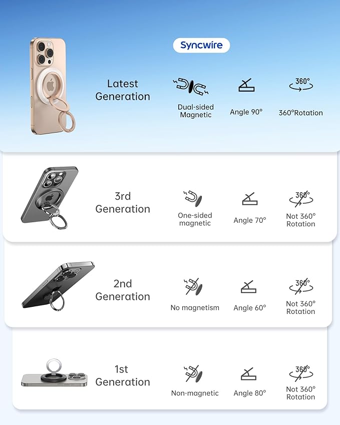 - 【Super Strong Magnetic & MagSafe Compatibility】 The Syncwire MagSafe Phone Grip is made with N52 NdFeB magnets, ensuring seamless attachment to MagSafe-enabled phones and cases with reinforced magnets. It also provides universal compatibility when used with the included magnetic ring for non-MagSafe devices. The magnetic strength increases by 5 times when used with the provided metal ring.