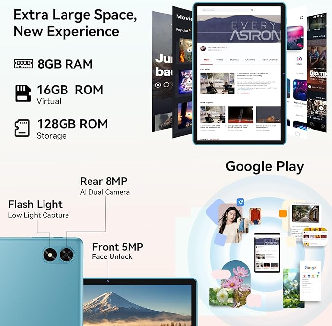 - 24GB (8GB + 16GB Extended) RAM & 128GB Storage: KELANYIS tablet features smart RAM allocation, enabling you to expand 8GB RAM to 16GB. Processing speed will be increased by 20%. With 128GB of internal storage, you can save a large number of files, apps, photos, and videos. It also supports storage expansion of up to 1TB via an external memory card. No more anxiety about running out of memory on your tablet