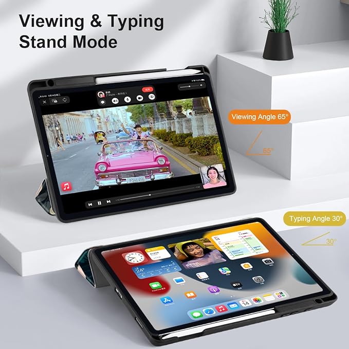 - 【Convenient Function】Sensitive Auto Wake/Sleep, More energy saving. Slim Lightweight Tri-fold Stand with viewing and typing angle. ∠65 ° video mode can act as a screen stand; ∠30 ° input mode acts as a keyboard stand.Solid construction but no bulky, Precise cutouts easily access to all buttons.