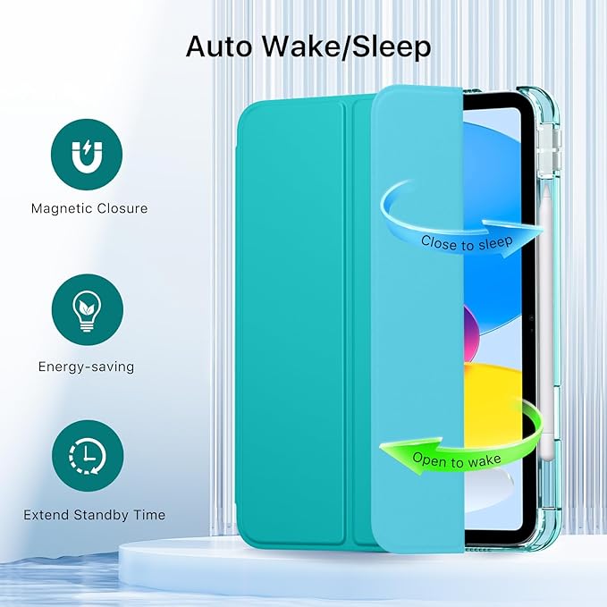 - Auto Sleep/Wake Function: The slim iPad case 10th generation supports auto sleep and wake feature, open or close the case, wake up the tablet or put it into sleep, save battery power and extend the use time. Precise cutouts support Touch ID functionality, and easy access to buttons, ports, speakers and more