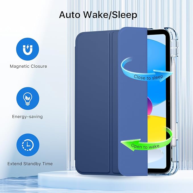 - Auto Sleep/Wake Function: The slim iPad case 10th generation supports auto sleep and wake feature, open or close the case, wake up the tablet or put it into sleep, save battery power and extend the use time. Precise cutouts support Touch ID functionality, and easy access to buttons, ports, speakers and more