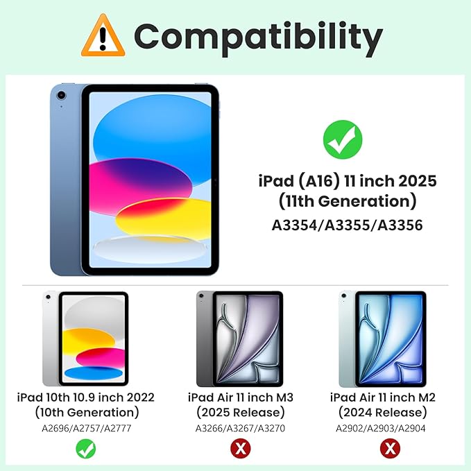 - Compatibility: Specially designed for iPad (A16) 11th generation 11-inch 2025 (Model: A3354,A3355,A3356), iPad 10th generation 10.9-inch 2022 (Model: A2696, A2757, A2777). Note: It will not be compatible with other models