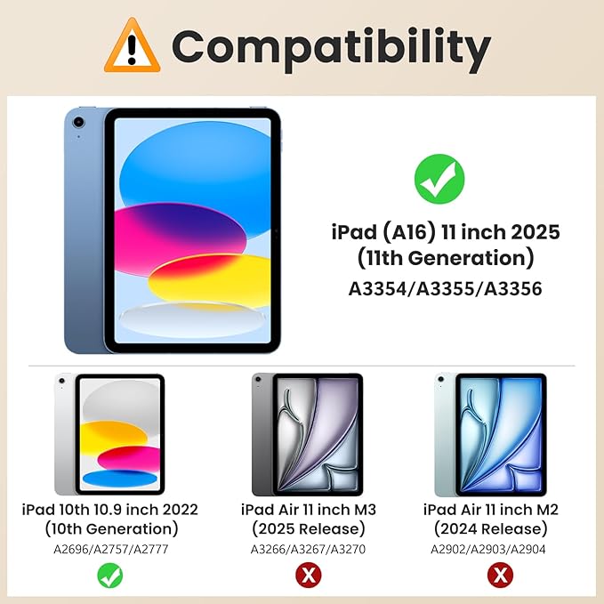 - Compatibility: Specially designed for iPad (A16) 11th generation 11-inch 2025 (Model: A3354,A3355,A3356), iPad 10th generation 10.9-inch 2022 (Model: A2696, A2757, A2777). Note: It will not be compatible with other models