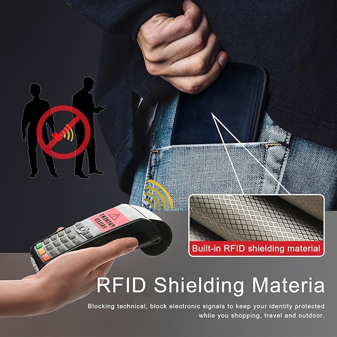 - [Credit Card Anti-Theft Swipe Function]---This RFID Blocking leather wallet case is designed to protect your card information.The RFID Shielding Technology to block unauthorized access.Many cards,including credit,debit and ID cards,contain an RFID chip.(This chip can be read by an RFID reader from up to 10 feet(about 3 meters) away, without any physical contact.)