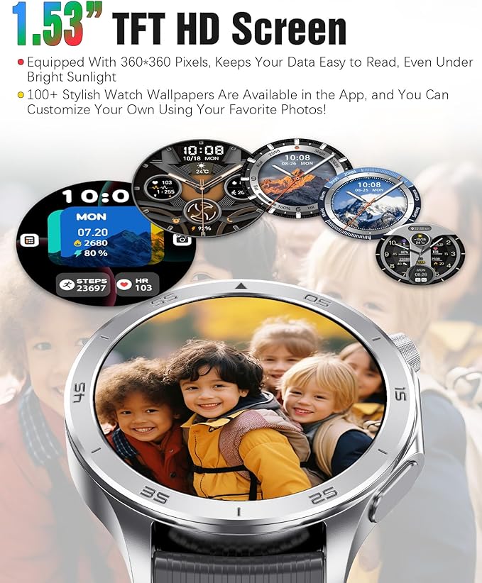 - Military Mens Smartwatch: 1.53" TFT HD full touch screen, 360*360 pixels, "Always On Display" mode, where the watch always shows the time even when it's "asleep", with access to 100+ exquisite watch dials available in the App, including 2 specifically for "Always On Display" mode. Durable zinc alloy watch case & stainless steel strap for all-day comfort, plus a gift silicone band for sports
