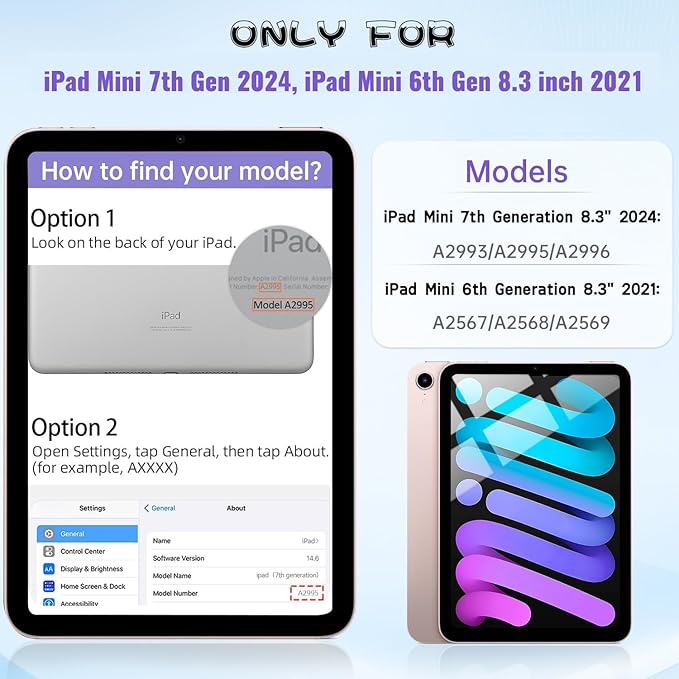 - Compatibility: DreamerX Cute Case for Apple iPad Mini 7 (A17 Pro) 8.3 inch 2024 (Model: A2995 A2996 A2993) and iPad Mini 6 (A15 Bionic) 8.3 inch 2021 (Model: A2567 A2568 A2569). Please double check the model number on the back of tablet (A****) before purchase. (Screen protector and pencil are not included!)