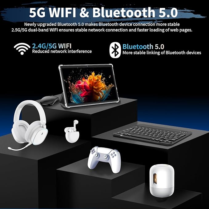 - 【10.1-inch IPS Display and 5G WIFI】 This 10.1-inch tablet features a 1280 x 800 IPS HD display for clearer and brighter photos and videos, and 2.4Ghz/5Ghz Wi-Fi for clearer video calls and more enjoyable web surfing.