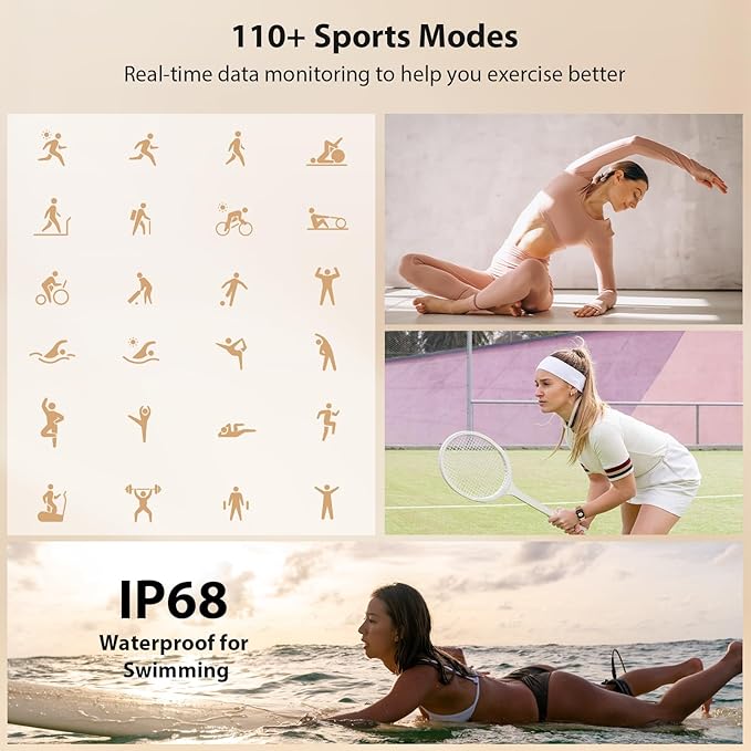 - PREMIUM FITNESS PARTNER: This fitness tracker supports up to 110+ mainstream exercise modes, acquires advanced metrics for various workouts, and tracks the intensity of your workout.Its IP68 waterproof rating ensures confidence during aquatic adventures or daily use.