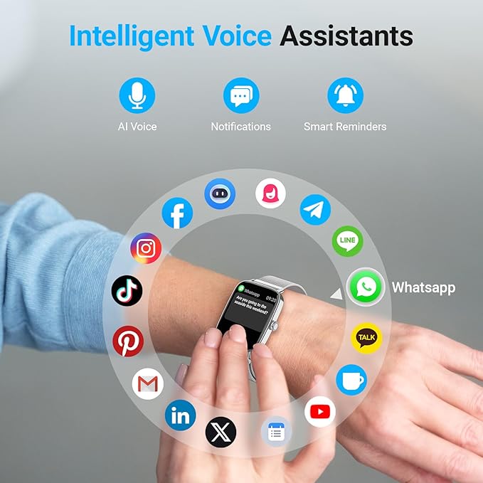 - 【Stay Connected On the Go】Make and answer calls, receive texts and app notifications, and access your phone’s AI voice assistant right from your wrist. You can also adjust volume when your phone is nearby. (Note: Message sending and replying not supported.)