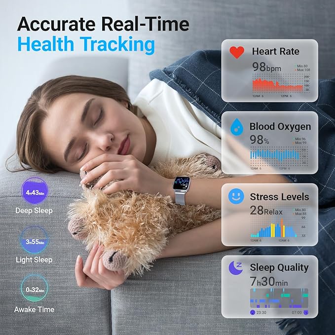 - 【Advanced Health & Fitness Tracking】Stay on top of your wellness with 24/7 monitoring features like SpO2 blood oxygen(Non-medical use), heart rate, step count, calories burned, sleep stages, distance, and stress levels—all displayed on a stunning 1.85" full-touch screen