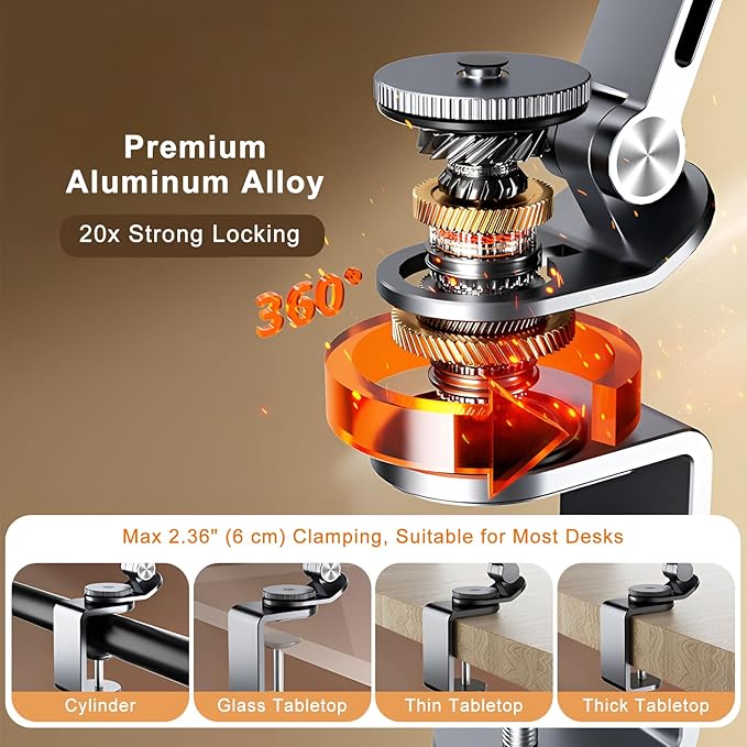 - 【FULLY ADJUSTABLE DESIGN】Featuring a 3-section long arm and 360° rotating base, this tablet holder mount offers greater flexibility and longer reach. It bends and rotates for the perfect viewing angle, whether you're standing, sitting, or lying down. Ideal for watching movies, gaming, reading, or cooking.