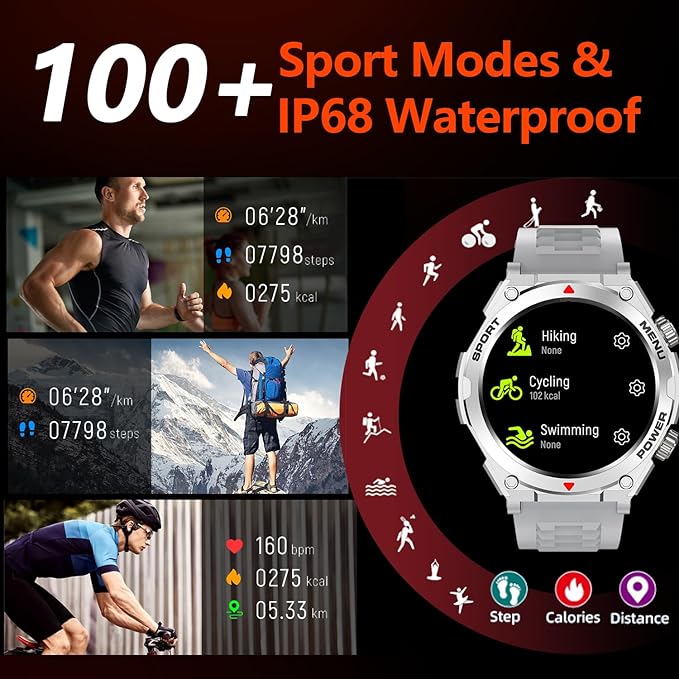 - 100+ Sport Modes & 24/7 Health Monitoring: Men's fitness tracker smartwatch upgraded sensors track 100+ activities (running/hiking/etc.) with precise real-time stats (steps/calories/distance/etc.). 24/7 health monitoring includes heart rate, SpO2, stress, and sleep stages (deep/light/awake).
