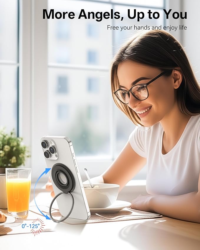 - 360°Rotate & 180°Flip: Experience effortless magsafe phone grip flexibility! The phone ring holder features ultra-smooth 360°rotation combined with 180°flipping, enabling perfect mag safe kickstand positioning for hands-free viewing, video calls, TikTok or comfortable hand-held use at any angle.