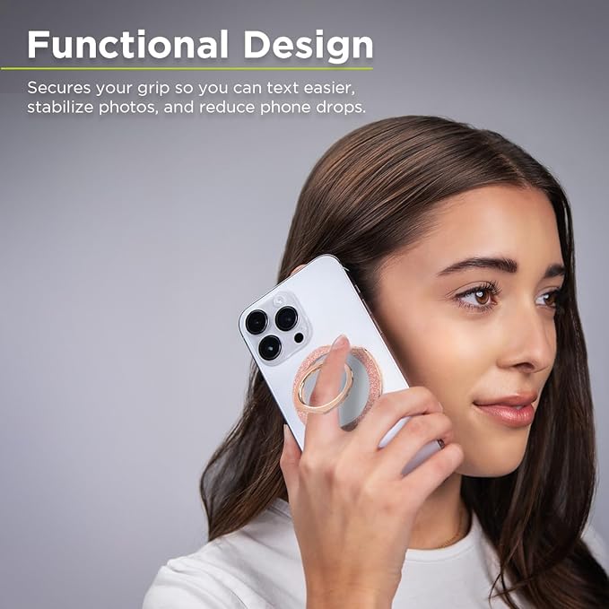 PureGear Magnetic Phone Grip Ring Stand, Magnetic Phone Ring Holder for MagSafe iPhone 16, 16Pro, 16Plus, 16ProMax, 15, 15Plus, 14, 14ProMax, 13,12, Adjustable Kickstand(Chrome Rose Gold Pink Glitter)