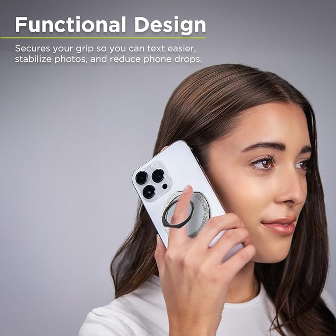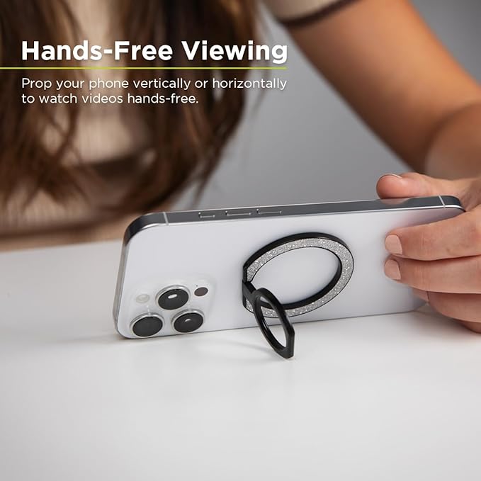PureGear Magnetic Phone Grip Ring Stand, Magnetic Phone Ring Holder for MagSafe iPhone 16, 16Pro, 16Plus, 16ProMax, 15, 15Plus, 14, 14ProMax, 13,12, Adjustable Kickstand((Brushed Black Silver Glitter)