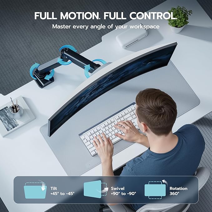 - Ergonomic Comfort & Full Motion - A monitor placed too high, too low, or at the wrong distance can lead to neck and shoulder pain over time. That’s why a monitor arm is more than just an accessory—it’s a game changer for your comfort and health. Unlike standard monitor stands, this fully adjustable arm gives you the flexibility to position your screen exactly where you need it for proper ergonomics.Enjoy effortless adjustments with a wide range of motion: tilt from +45° to -45°, swivel from +90° to -90°, and full 360° screen rotation. Whether you're working, gaming, or multitasking, you’ll always have the perfect viewing angle